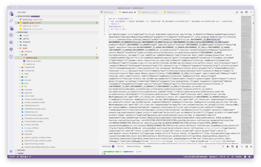 It wasn’t clear to me and I’ve researched it what the is for but the two that we’re interested with are opencv.js and opencv_js.wasm files. The files are created to be distributed so in the case of the opencv.js file, the file tripped my VSCode editor as some of the JS code was in a single line that exceeds the max line length, making Intellisense trip and crashing the plugin. Due to this line break issue, this will also break your @angular/cli build if you integrate it as is. I had to import the file in a Javascript editor to be able to format it correctly and be able to view it in VSCode.