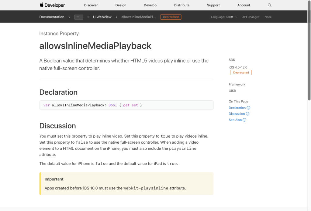 I highlighted most in the last sentence of the previous paragraph because you will most certain run into cases where it just doesn’t work. My specific case was iOS 10 and 11 iPhones running an app rendering an Angular app using a custom WebView. The video tag in that app would respect the autoplay attribute as soon as the user interacted with the page, as specified in the iOS technical guidelines for autoplay but would simply ignore the playsinline attribute and play the video full screen. It took quite a bit of Googling and trial and error to finally get it working but if you run into the same error, here are things to check for to get you up and running: